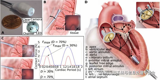 為提升介入手術(shù)的智能化、自主化,哈佛大學(xué)醫(yī)學(xué)院[4]從趨觸性的昆蟲中獲得靈感,研發(fā)了一種新型機(jī)器人導(dǎo)管。它可以在充滿血液的心臟中導(dǎo)航,這種導(dǎo)管使用混合觸覺、視覺的感知方法,使用圖像進(jìn)行基于觸摸的表面識(shí)別和力傳感,以完成充滿血液的心臟內(nèi)壁跟蹤。觸覺視覺傳感器提供了導(dǎo)管尖端的G分辨率視圖,這正是壁跟蹤和設(shè)備部署所需的視圖。該傳感器與機(jī)器學(xué)習(xí)和圖像處理算法相結(jié)合,使機(jī)器人能夠區(qū)分其接觸的物體并控制其接觸力。但在一些特殊、復(fù)雜的位置移動(dòng)時(shí),如:主動(dòng)脈瓣環(huán),成功率還有待提升。在未來,壁跟蹤自主導(dǎo)航可擴(kuò)展到許多微創(chuàng)手術(shù),包括血管、氣道、胃腸道和腦心室系統(tǒng)的手術(shù)。