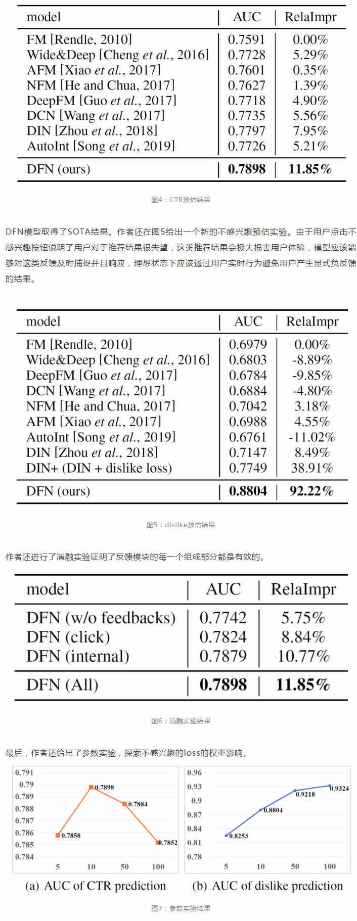 DFN模型使用了internal feedback interaction component抓住用戶行為序列中的細粒度的行為級別的交互,然后通過external feedback interaction component,使用準確但稀少的隱式正反饋和顯式負反饋作為監(jiān)督,從噪音較多的隱式負反饋中進一步抽取用戶的正負反饋信息。在實驗中,作者基于微信看一看的數(shù)據(jù),進行了豐富的離線和在線實驗,模型與baseline相比均取得顯著提升。