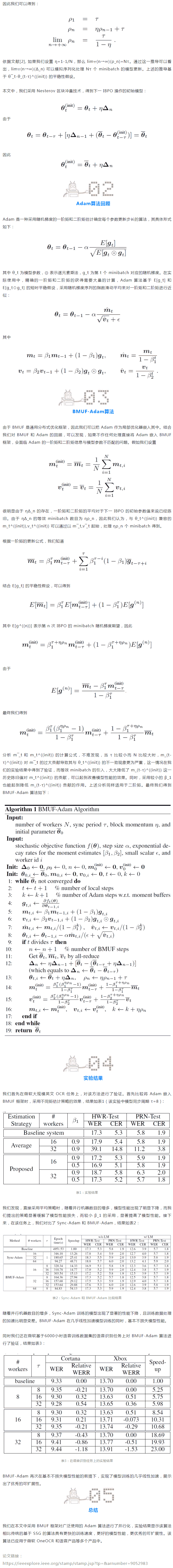 在基于 BMUF 的訓練框架下,假設我們總共有 N 個并行工作機,一個工作機可以是一塊或多塊 GPU 卡,也可以是一個計算節(jié)點。給定一個包含 Nτ 個 minibatch 的訓練數(shù)據(jù)子集,首先我們將這些數(shù)據(jù)均勻分布到 N 個并行工作機,每臺工作機獲得 τ 個 minibatch。從一個共同的初始模型 θ_(t-τ)^((init)) 開始,N 個工作機獨立更新各自的局部模型 τ 步,得到 {θ_(t,1),θ_(t,2),…,θ_(t,N)},對局部模型取平均得到 θ ̅_t。這一過程稱之為數(shù)據(jù)塊內(nèi)并行優(yōu)化(Intra-Block Parallel Optimization, IBPO)。與直接將 θ ̅_t 作為全局模型不同,BMUF 技術將歷史更新信息與當前更新信息結合,得到全局模型: