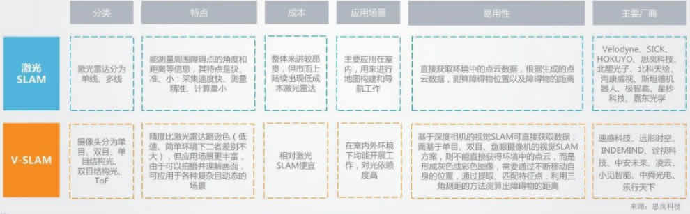 SLAM系統(tǒng)通常包含多種傳感器和多種功能模塊。按照核心的功能模塊區(qū)分,目前常見的機(jī)器人SLAM系統(tǒng)可分為兩種形式:基于激 光雷達(dá)的SLAM(激光SLAM)和基于視覺的SLAM(V-SLAM)。激光SLAM目前發(fā)展比較成熟、應(yīng)用廣泛,未來多傳感器融合的SLAM 技術(shù)將逐漸成為技術(shù)趨勢,取長補(bǔ)短,更好地實(shí)現(xiàn)定位導(dǎo)航。