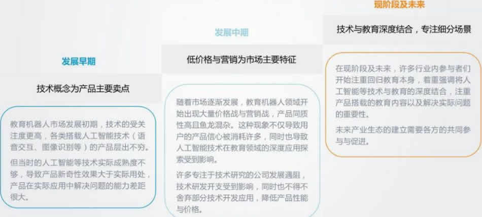 教育機(jī)器人經(jīng)歷了從概念先行到價(jià)格營(yíng)銷(xiāo)到回歸內(nèi)容與價(jià)值本質(zhì)的發(fā)展階段變遷。
