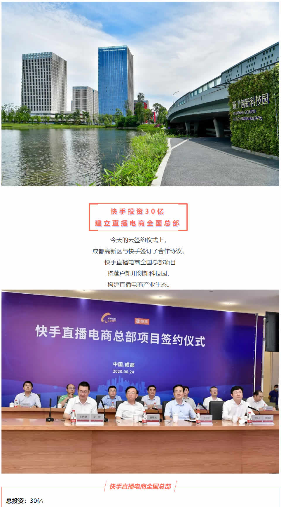 成都G新區(qū)分別與頭部短視頻平臺快手、中國互聯(lián)網(wǎng)BAT三巨頭之一的百度簽約,宣布快手直播電商全國總部項目和百度智能駕駛項目落戶新川創(chuàng)新科技園。