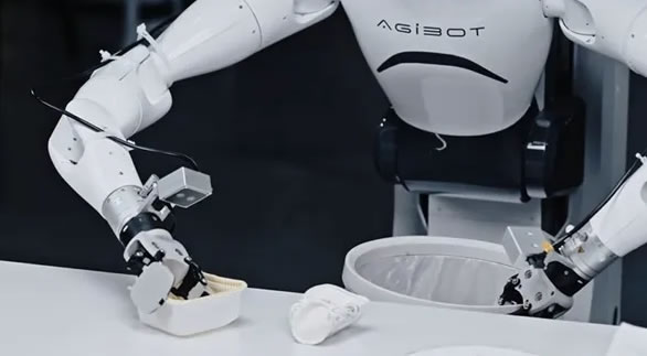 2)視覺+觸覺下,靈巧手準(zhǔn)確執(zhí)行酒杯和酒瓶的抓握,雙臂+雙手協(xié)同完成倒酒操作。 同樣在家用場(chǎng)景中,智元機(jī)器人可實(shí)現(xiàn)一手將日用品放入被另一只手提著的手提袋內(nèi), 協(xié)同效應(yīng)較好;同時(shí),揀取桌面不同位置的垃圾并置于垃圾桶中。
