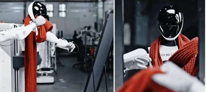 1)機(jī)器人保持動(dòng)作柔順性與位姿穩(wěn)定性,雙手靈巧配合,可以完成具有生物運(yùn)動(dòng)特征的圍巾佩戴任務(wù),先模型通過觀察鏡子中圍巾和頭的相對(duì)位置,完成圍巾的初始佩戴, 然后根據(jù)兩側(cè)的長(zhǎng)度比例,左手準(zhǔn)確的握住需要調(diào)整的一端,將其拉到適當(dāng)?shù)奈恢茫? 后右手接過左手遞過來的圍巾執(zhí)行“圍”的螺旋纏繞動(dòng)作。