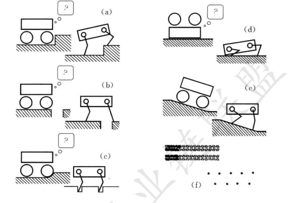 腿式移動(dòng)機(jī)器人特別適合于粗糙地形,在這種地形上,它們能夠橫越輪式系統(tǒng) 不能通過的障礙,如(a) 臺(tái)階,(b) 裂隙,或(c) 沙斑。另外,當(dāng)機(jī)器人跌倒時(shí),高 數(shù)目的自由度容許機(jī)器人站起來(d) 并保持負(fù)重平衡(e)。由于腿式系統(tǒng)不需 要支撐的連續(xù)路經(jīng),它們可以依靠少數(shù)幾個(gè)所選的立腳點(diǎn),從而減少對(duì)環(huán)境的 影響(f) 。