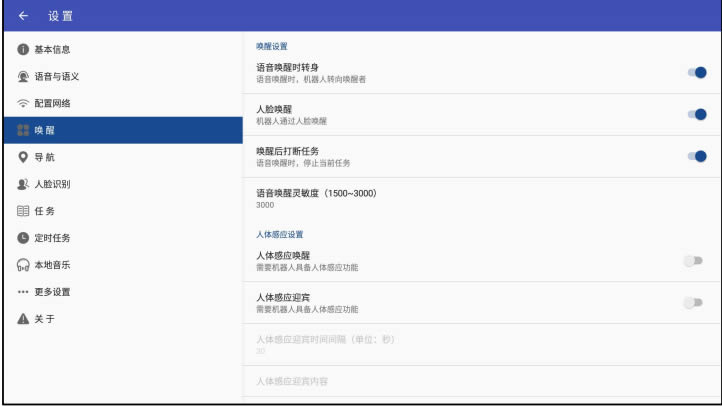 喚醒包含:人臉喚醒,語(yǔ)音喚醒,人體感應(yīng)喚醒。用戶(hù)可根據(jù)自己要求修改喚醒迎賓詞, 喚醒間隔時(shí)間