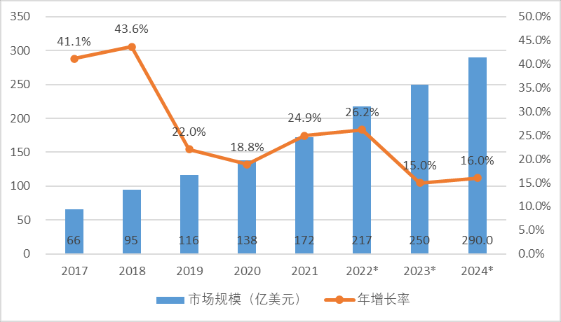 預(yù)計 2022 年, 服務(wù)機器人市場規(guī)模達到 217 億美元。 2024 年, 全 球服務(wù)機器人市場規(guī)模將有望增長到 290 億美元。
