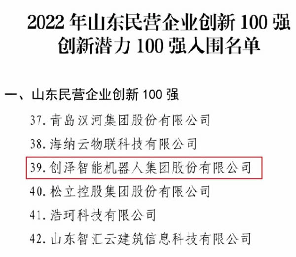 創(chuàng)澤機(jī)器人入圍2022年山東民營(yíng)企業(yè)100強(qiáng)名單【喜訊】 |