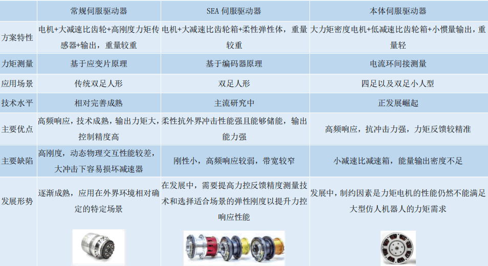 伺服驅(qū)動器、本體伺服驅(qū)動器。常規(guī)伺服驅(qū)動器主要由力矩電機(jī)、諧波減速器、電機(jī)編碼器、輸出